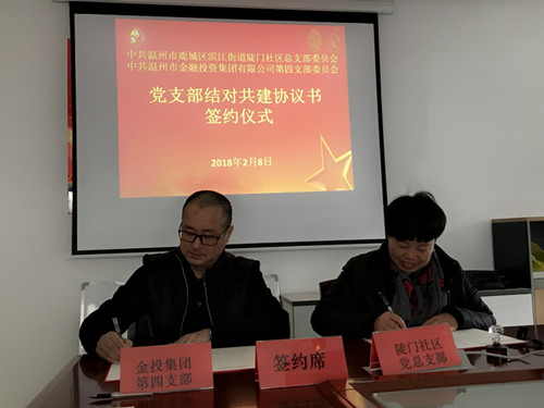 为加强国有企业基层党组织与社区党组织的联系,共同推进城市社区和国企党建工作。2月8日下午,温州市金投集团第四党支部与滨江街道陡门社区党总支部举行结对共建签约仪式,签订共建协议书。双方将通过宣传教育、文明交通、环境秩序、公益活动等开展共建互动。...