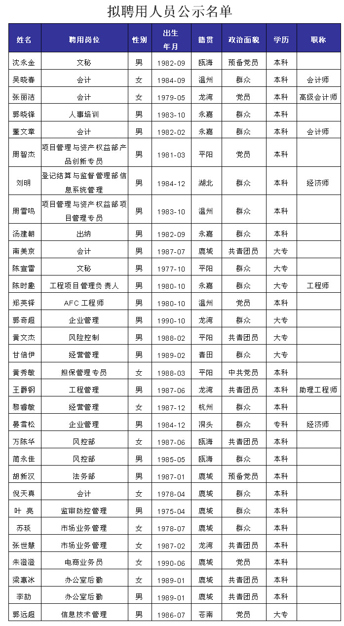 温州市金融投资集团有限公司公开招聘拟聘用人员公示(第二号)