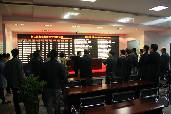 考察期间,考察团一行首先认真观看了温州金融投资集团宣传片,仔细听取温州金改广场相关成立背景、基本情况等介绍。随后,考察团陆续参观了广场多个入驻单位,并与温州市股权营运中心、温州金融资产交易中心、温州农村产权交易中心、滨江创业服务社等单位开展业务交流。在广场二楼大厅,考察团一行认真了解了温州市股权营运中心股权交易流程,工作人员就考察人员提出的各类问题给予解答。