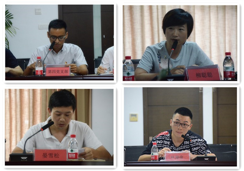 会上,集团第四党支部叶方杰同志,优秀党员柳聪聪同志、优秀党务工作者晏雪松同志、预备党员叶翔俊同志先后作发言。他们从如何打造“四强四优”党建示范点,如何发挥党员先锋模范作用,如何做好基层党务工作,如何在思想上、行动上入党等方面讲述作为共产党员在平凡岗位上,争做时代先锋的故事。