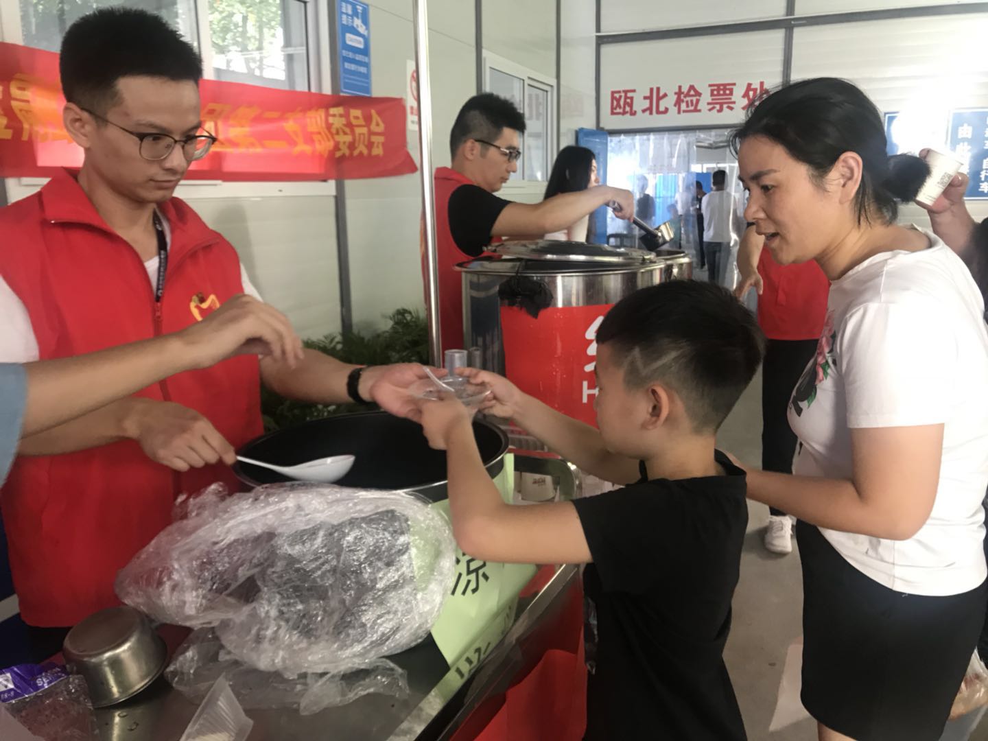 准备工作完成之后,党员们积极行动,将清凉饮品送给烈日下辛苦工作的工作人员、来往乘客和过路行人。在高温中为大家送去丝丝清凉。党员们还热心地帮助渡轮乘客提大件行李,扶老携幼