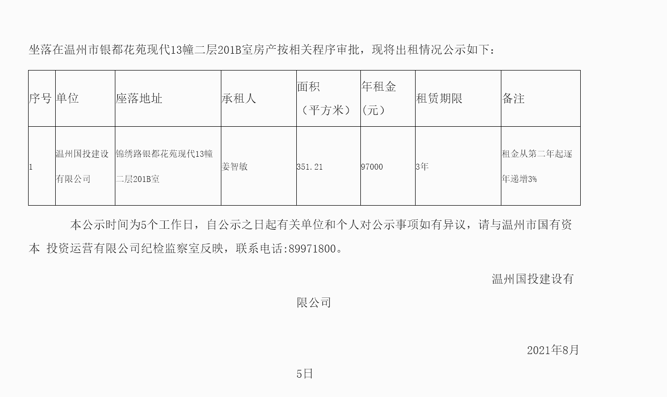 温州市国资运营公司下属温州国投建设有限公司关于银都花苑现代13幢二层201B室房产租赁结果公示