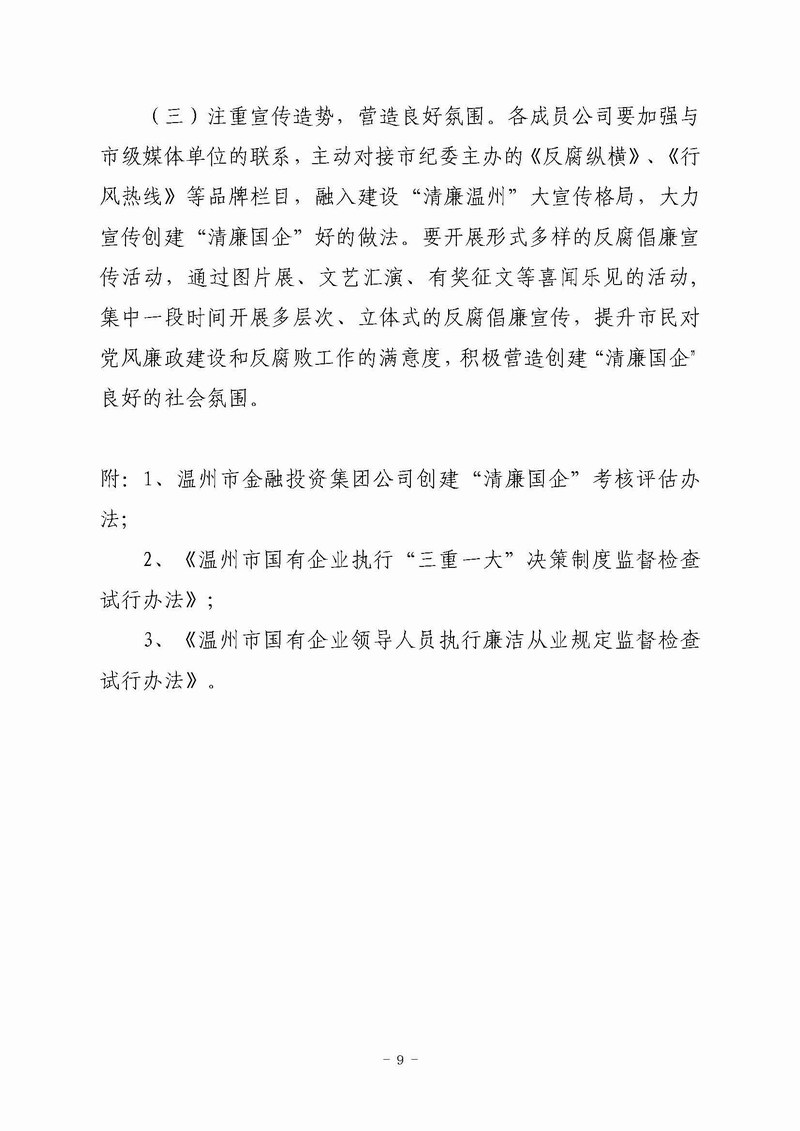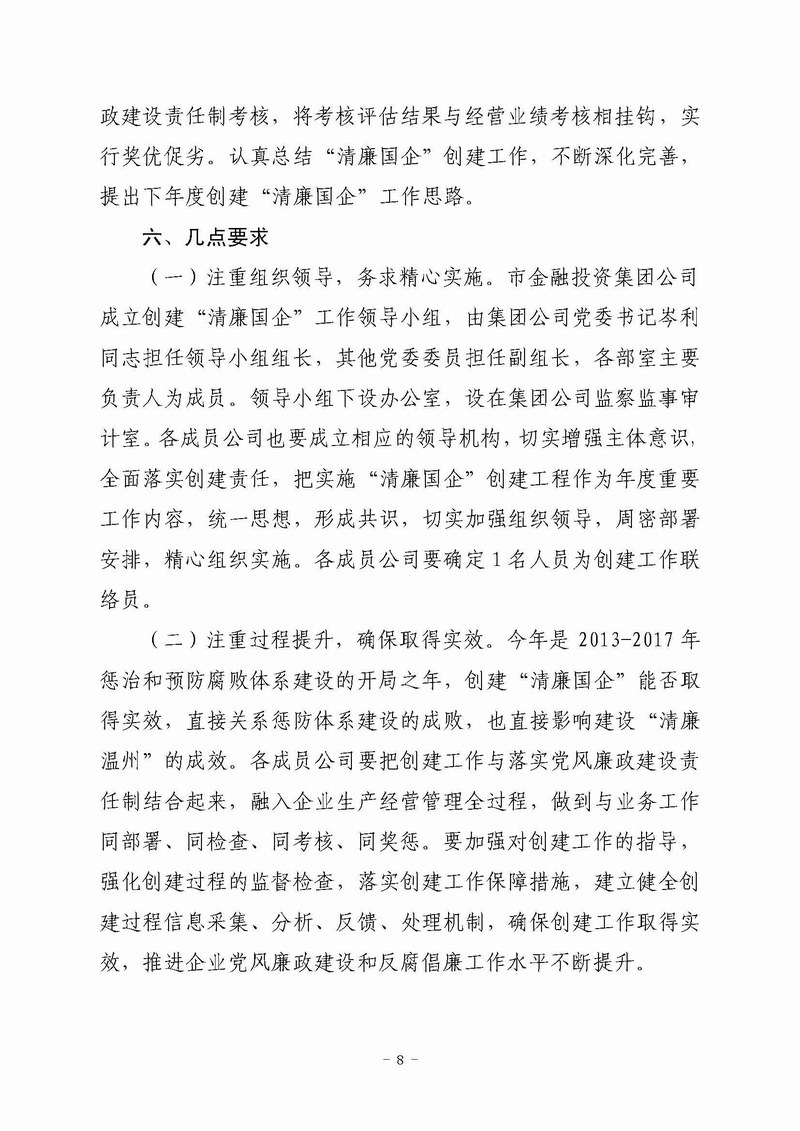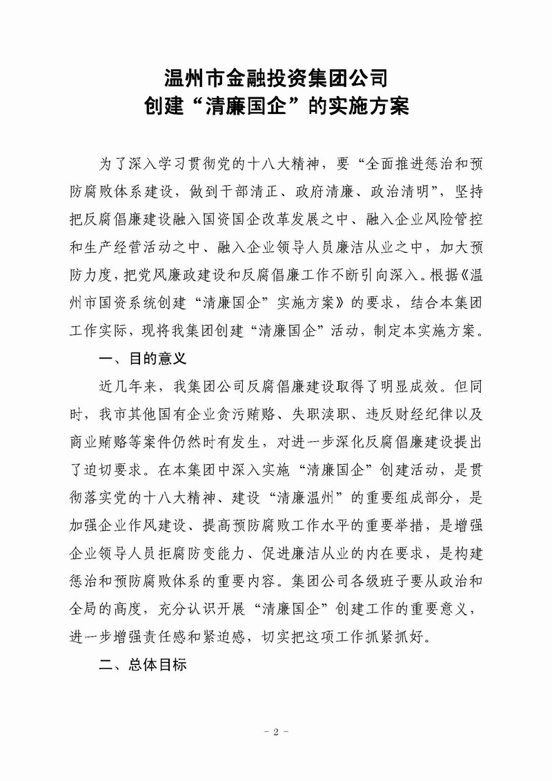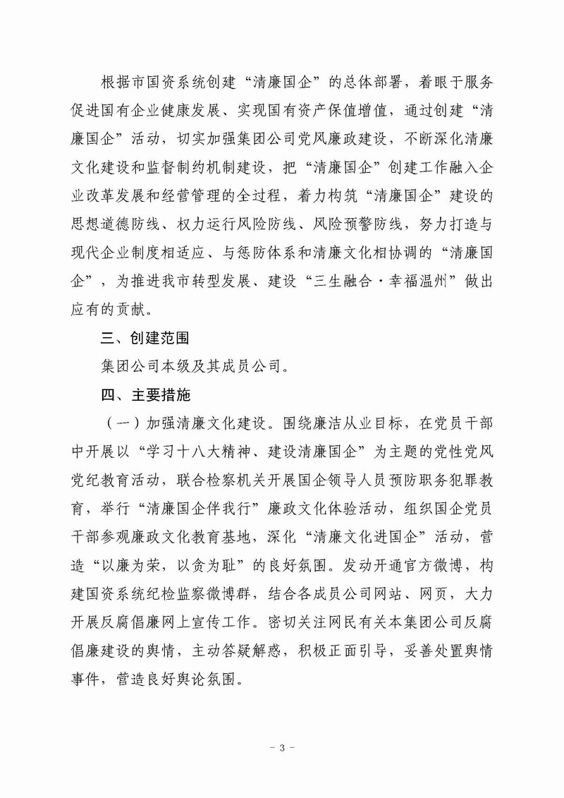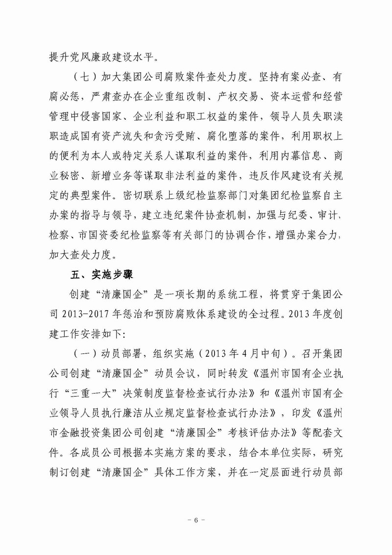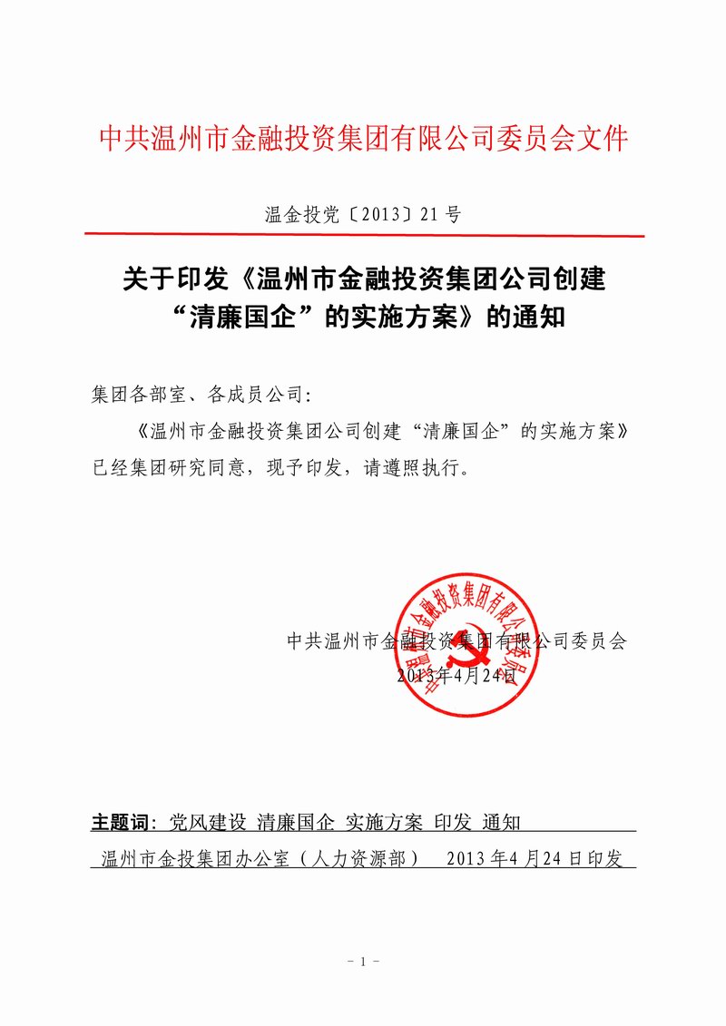 关于印发《温州市金融投资集团公司创建“清廉国企”的实施方案》的通知(温金投党〔2013〕21 号)