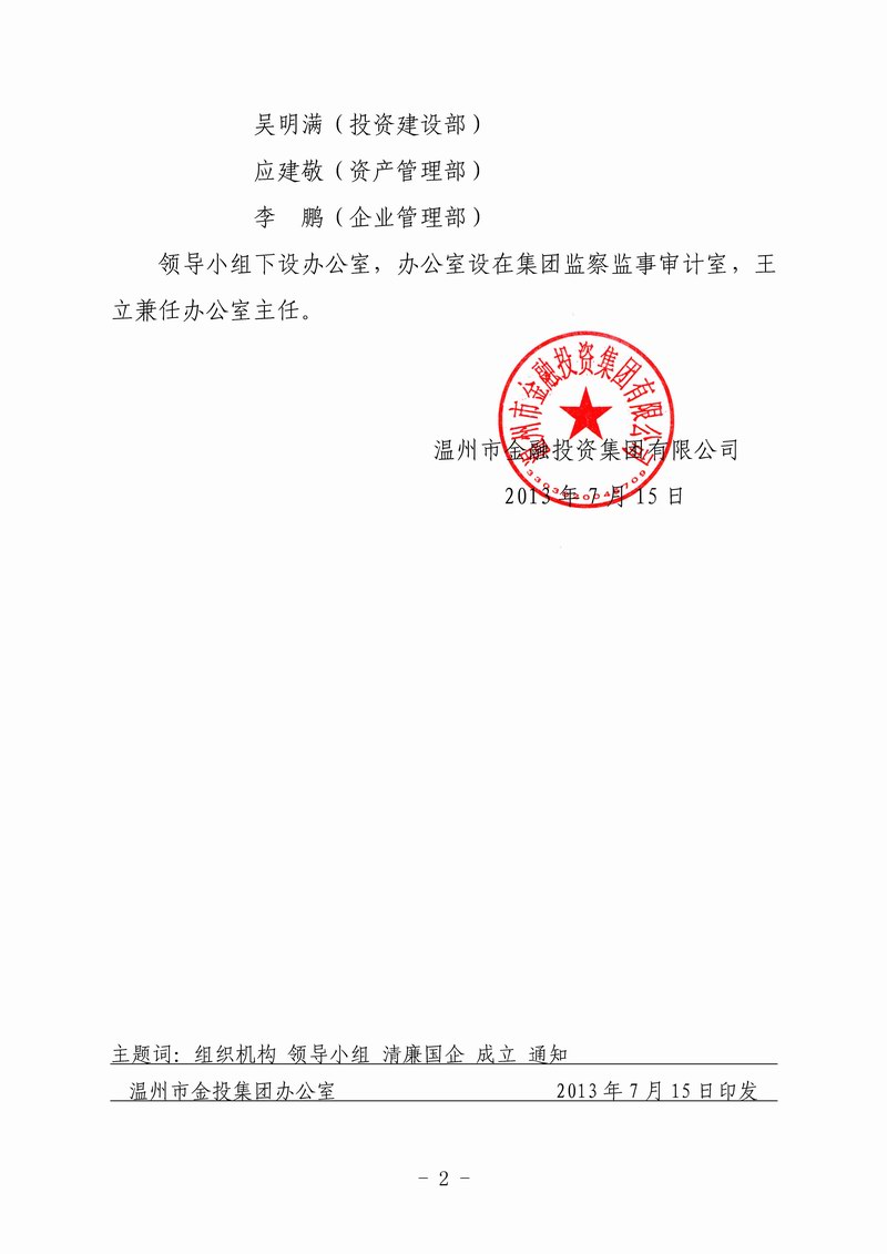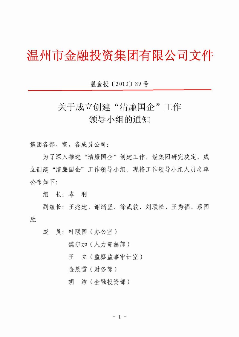 温金投〔2013〕89号关于成立创建“清廉国企”工作领导小组的通知 [清廉国企]