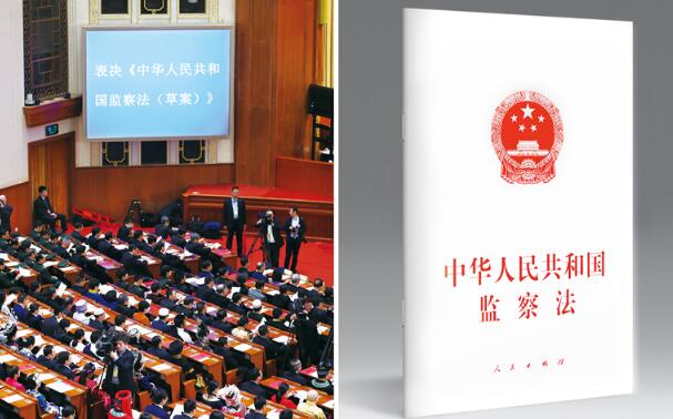 2018年3月20日,第十三届全国人民代表大会第一次会议在北京人民大会堂举行闭幕会。会议经表决,通过了监察法,国家主席习近平签署第三号主席令予以公布。左图为第十三届全国人民代表大会第一次会议闭幕会正在表决《中华人民共和国监察法(草案)》(新华社记者 丁海涛/摄),右图为《中华人民共和国监察法》。