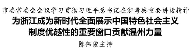 会议强调,要迅速掀起学习贯彻习近平总书记重要讲话精神的热潮,坚持以“八八战略”为统领,牢记习近平总书记寄予温州“续写创新史”的殷殷嘱托,干在实处、走在前列、勇立潮头,确保实现今年经济社会发展目标任务,在浙江成为新时代全面展示中国特色社会主义制度优越性的重要窗口的宏伟实践中提供更多温州素材和温州实践。