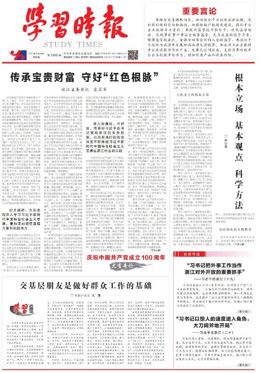 中国共产党从南湖红船启航,这里是我们党的根脉,同时浙江是习近平新时代中国特色社会主义思想的重要萌发地。浙江省委十四届八次全会明确提出了浙江在新发展阶段必须扛起的“五大历史使命”,即书写忠实践行“八八战略”的新篇章、展示奋力打造“重要窗口”的新成果、展现探索构建新发展格局有效路径的新担当、开启争创社会主义现代化先行省的新征程和提升党员干部队伍推进现代化建设的新能力,这是浙江党员干部必须进行的一场新时代“赶考”。我们要学懂弄通做实习近平新时代中国特色社会主义思想,把守好“红色根脉”作为义不容辞的政治行动,在扛起“五大历史使命”上奋力争先创优、打造最新成果、展示硬核担当。
