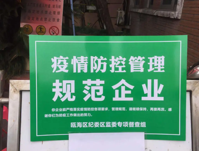 该公司作为瓯海区白名单第一家复工复产企业,严格落实属地政府复工防控方案,通过建立入厂防疫检查制度、厂区消杀制度、员工宿舍及食堂防疫管控制度等,经瓯海区纪委检查合格后,被评为“疫情防控管理规范企业”称号。