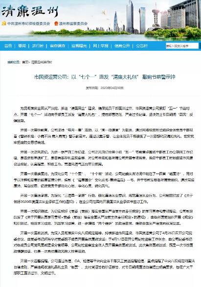 清廉温州刊发《市国资运营公司:以“七个一”派发“清廉大礼包” 敲响节前警示钟》全文如下: